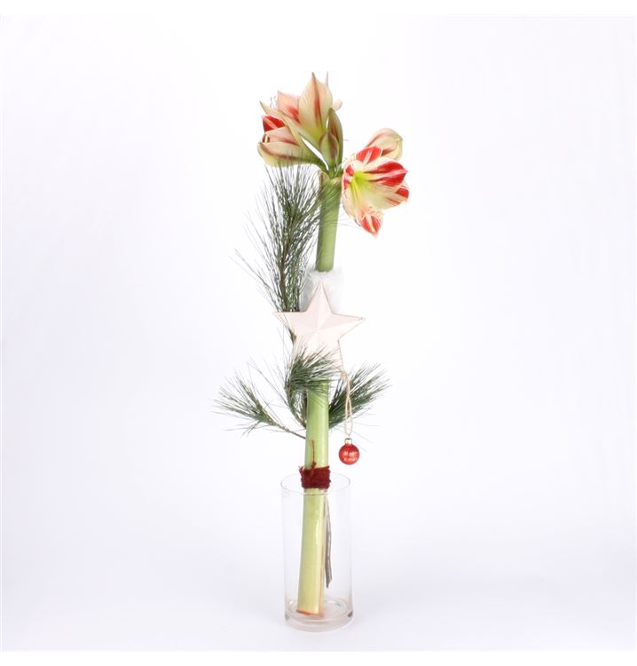 Eine Amaryllis ist mit Kiefer, Kugeln und anderen weihnachtlichen Accessoires gebunden.