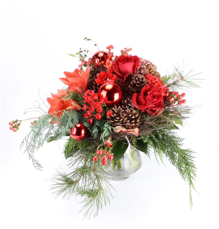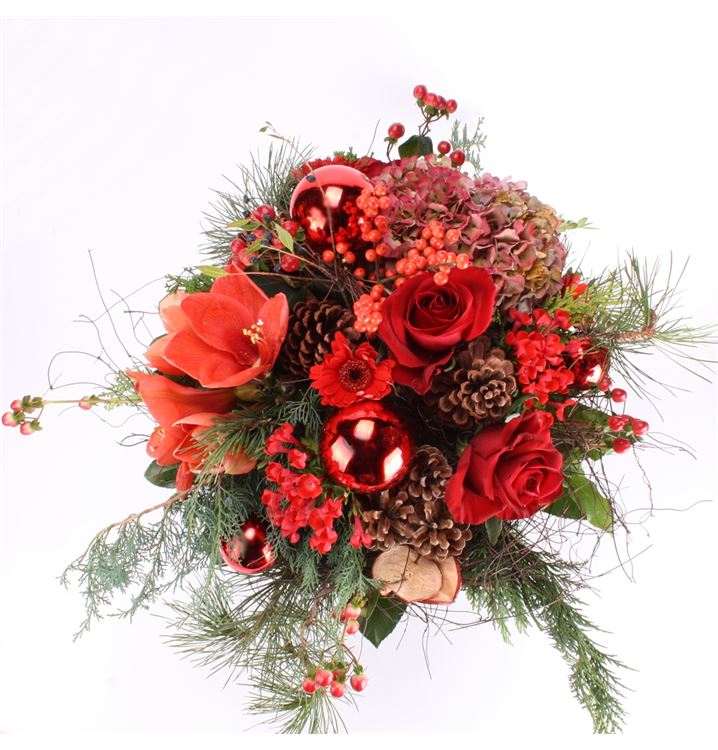 Ein wahrer Traum zum Weihnachtsfest. Ein prächtiger Blumenstrauß in warmem Rot aus z. B. Amaryllis, Rosen, Gerbera und anderen Blüten gebunden, dazu weihnachtliches Beiwerk wie Zapfen, Kugeln und Kiefer. Die Abbildung entspricht der mittleren Preiskategorie.