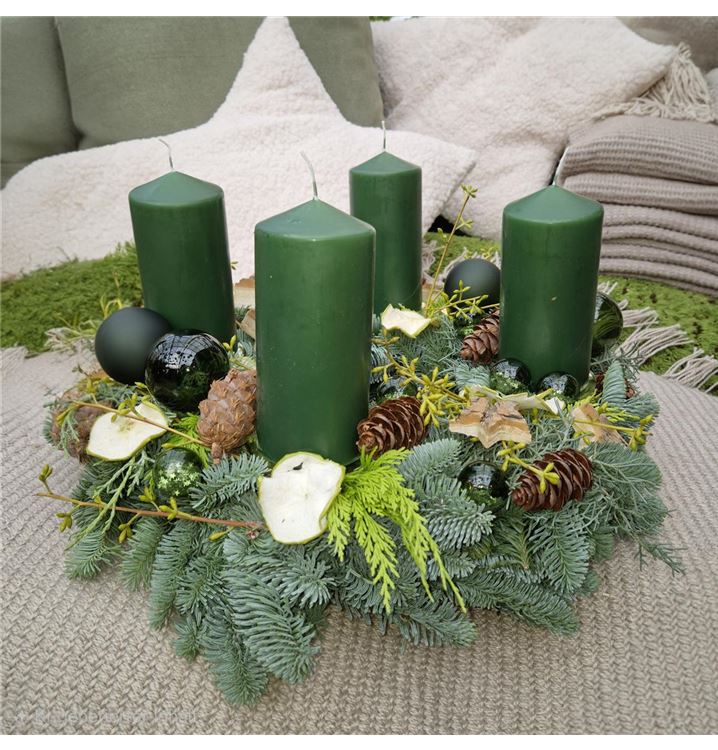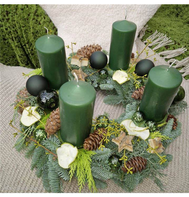 Dieser Adventskranz aus frischer Tanne strahlt eine ruhige, natürliche Eleganz aus. Die dunkelgrünen Kerzen greifen den Farbton des satten Tannengrüns auf und verleihen dem Kranz eine besonders harmonische, stimmige Wirkung. Passend dazu setzen dunkelgrüne Kugeln dezente, edle Akzente.