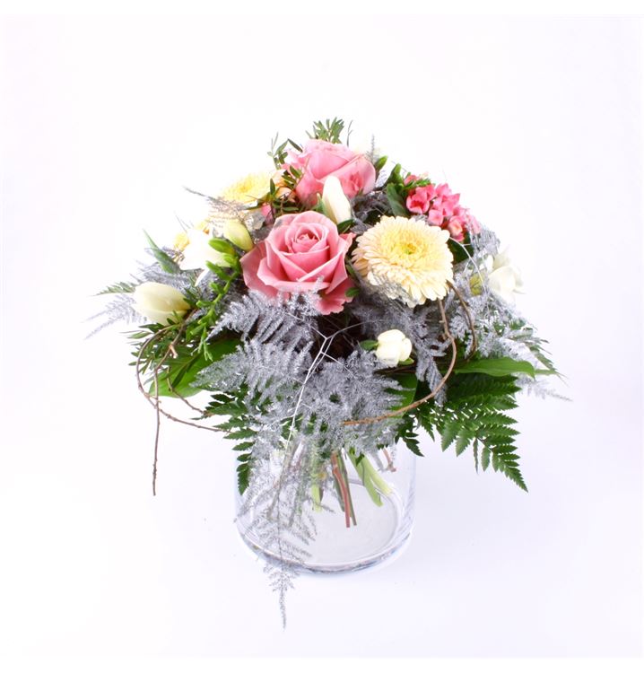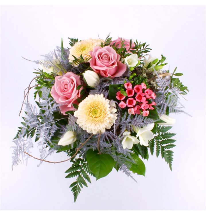 Ein silbern scheinender Blumengruß zum Jahreswechsel. Rund gebundener Blumenstrauß aus z. B. Gerbera, Rosen, Freesien und Bouvardien gebunden, mit verschiedenem Grün unterlegt.
