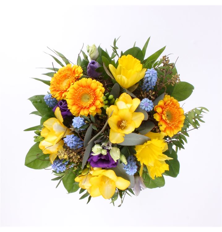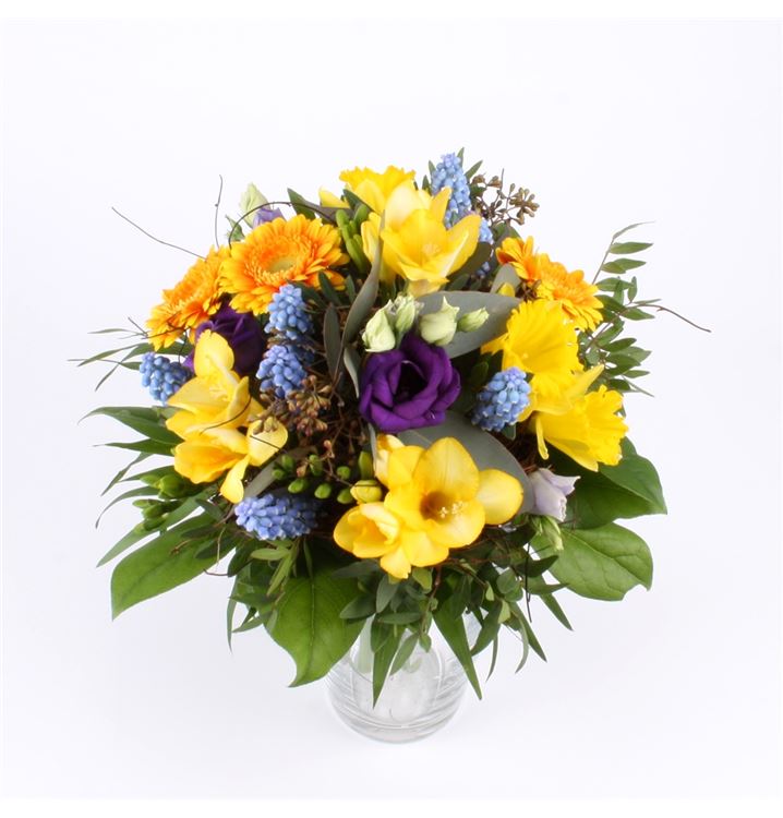 Die ersten warmen Frühlingstage wechseln sich ab mit kühlen Stunden. Verschenken Sie das Strahlen der Sonne mit diesem leuchtenden Blumenstrauß. Ein Frühlingsstrauß aus z. B. Freesien, Narzissen und Gerbera gebunden, mit einer Blattmanschette unterlegt. Die Abbildung entspricht der mittleren Preiskategorie.