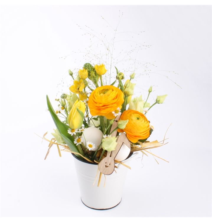 Frohe Ostern! Ein Blumengruß zu Ostern in den Farben Gelb und Weiß. Verschiedene Frühlingsblumen wie z. B. Tulpen und Ranunkel, kombiniert mit anderen Blüten und österlichen Accessoires sind in einem Gefäß arrangiert.