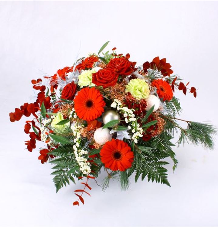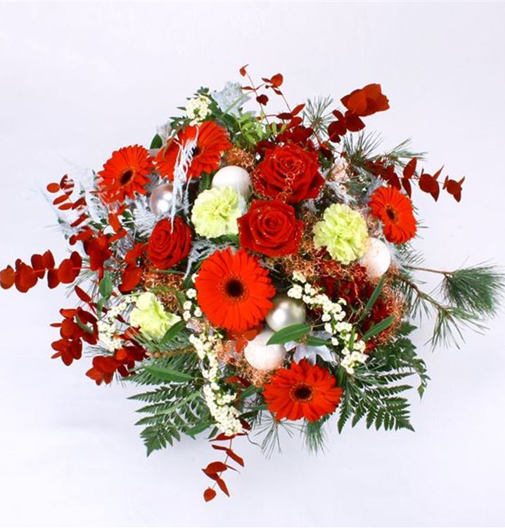 Ein weihnachtlicher Blumenstrauß in Rot-Weiß-Grün-Tönen. Von unserem Floristen-Team liebevoll aus z. B. Rosen, Gerbera, Nelken und weihnachtlichem Grün, sowie Kugeln gebunden. Verschicken Sie weihnachtliche Vorfreude in Chemnitz!