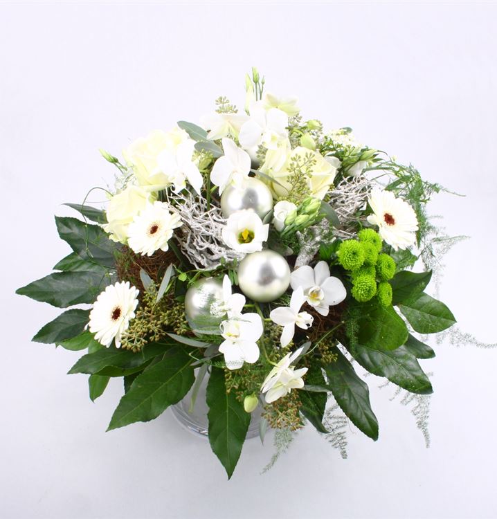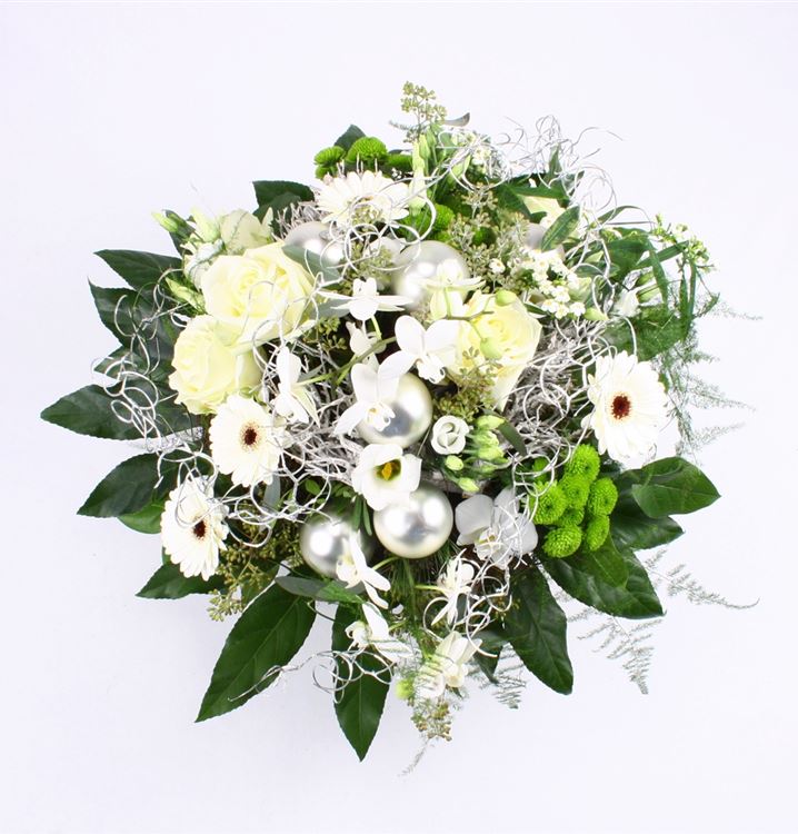 Schneebedeckte Landschaft, Sternenleuchten und Lichterglanz - so träumen wir von weißen Weihnachten. Verschenken Sie zu Weihnachten diesen weißen Blütentraum. Edle Phalaenopsis-Blüten werden z. B. mit Rosen, Minigerbera, kleinen Chrysanthemen und Beiwerk gebunden. Silberne Kugeln verleihen diesem prächtigen Strauß Glanz und Anmut.