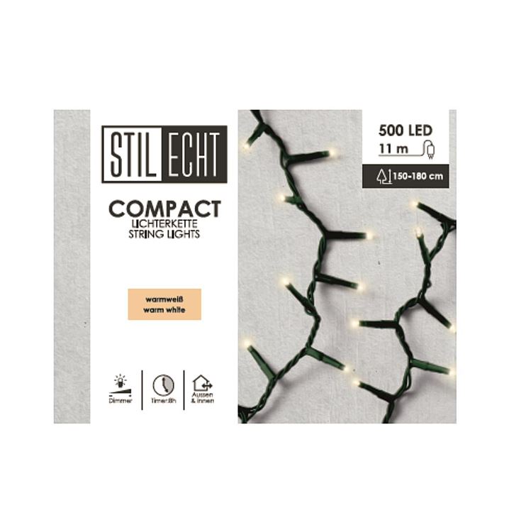 Die STILECHT Lichterkette Compact bringt Ihren Weihnachtsbaum mit 500 warmweißen LEDs gleichmäßig zum Leuchten. Mit 11 Metern Länge eignet sie sich ideal für Bäume von 150 bis 180 cm und fügt sich dank des grünen Kabels unauffällig zwischen den Zweigen ein.