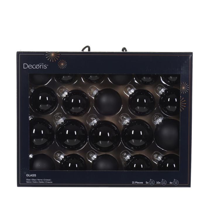Dieser edle Kugelmix in tiefem Schwarz verleiht Ihrem Weihnachtsbaum eine moderne, ausdrucksstarke und zugleich elegante Note. Die Kombination aus glänzenden, matten und transparenten schwarzen Glaskugeln schafft spannende Kontraste und bringt eine raffinierte, zeitgemäße Tiefe in Ihre Dekoration.